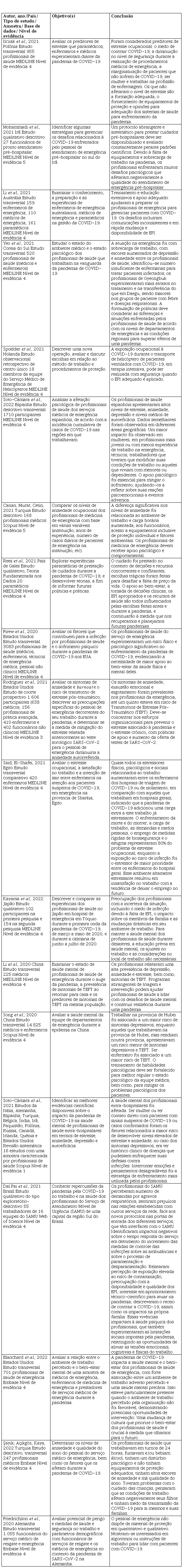 O bem-estar emocional e psíquico de profissionais foi perturbado pela pandemia de COVID-19, sendo apontado por 11 dos 19 estudos inclusos nesta revisão. As alterações das rotinas laborais habituais em um cenário crítico, elevou a vulnerabilidade dos profissionais à ansiedade, estresse e depressão, descrita em 11 estudos,1,5,23,15,16,17,25,21,18,26,27 transtorno de estresse pós-traumático,15,26,28 insôniae burnout. 5,17,19 Ademais, a prevalência desses sintomas psicoemocionais nos profissionais de saúde foi mais elevada do que na população geral.26 Além disso, a atuação profissional na pandemia relacionou-se com uma maior incidência de abuso de álcool e automedicação.5,29 Consistentemente, 4 estudos apontaram que as mulheres foram expressas como vulneráveis aos problemas mentais decorrentes da atuação na pandemia de COVID-19, isso se deve à predominância feminina na área da saúde, discriminação de gênero, síndrome do desgaste por empatia e imposição de conciliação entre a vida familiar e a profissional.1,25,29,27