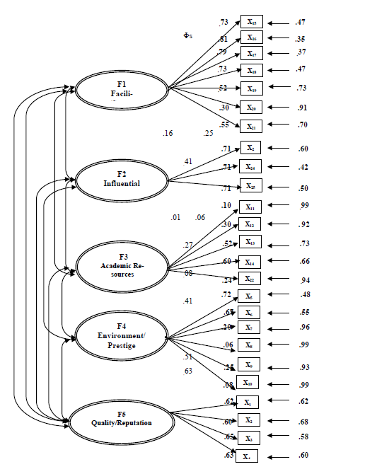 This is carried out by making some modifications in the initial model that will result in improvement in overall model fit. Realized the changes suggested by the significance of the individual parameter (drop I8, I10, and I11), the results related to the five-first-order modified model, in students’ decisions of university choice, showed a chi-square for the revised model of 865.34, with 200 degrees of freedom, this chisquare value is still statistically significant (p < .0001). These results show a moderate descend of approximately thirteen percent from that observed with the initial measurement model, where chisquare was 990.86, with 265 degrees of freedom. Also, these findings reveal that the modified measurement model provides significant factor loadings (all are statistically significant at p < .001); and shows an acceptable fit to the data, indicated by the Goodness of Fit Index (GFI), Adjusted Goodness of Fit In-dex (AGFI), Bentler’s Comparative Fit Index (BCFI), Bentler and Bonett’s Non-normed Fit Index (BBNNFI), and Bol-len Non-normed Fit Index (BNNFI), whose values are .923, .902, .873, .853, and .873, respectively. Therefore, these results provide support for the modified model, since the reliability of the factors also performed more adequately.