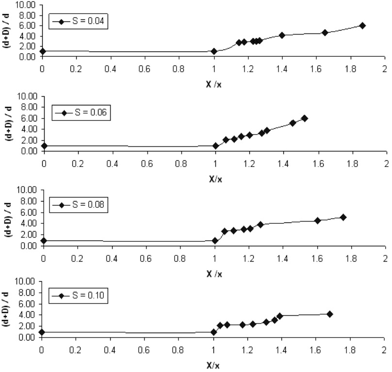 Los materiales de la matriz D3 presentan un recorrido casi uniforme con saltos longitudinales registrados de aproximadamente X/x = 1.7. Se presenta una alta elevación (d + D)/d cercana a 8 para S = 0.06.