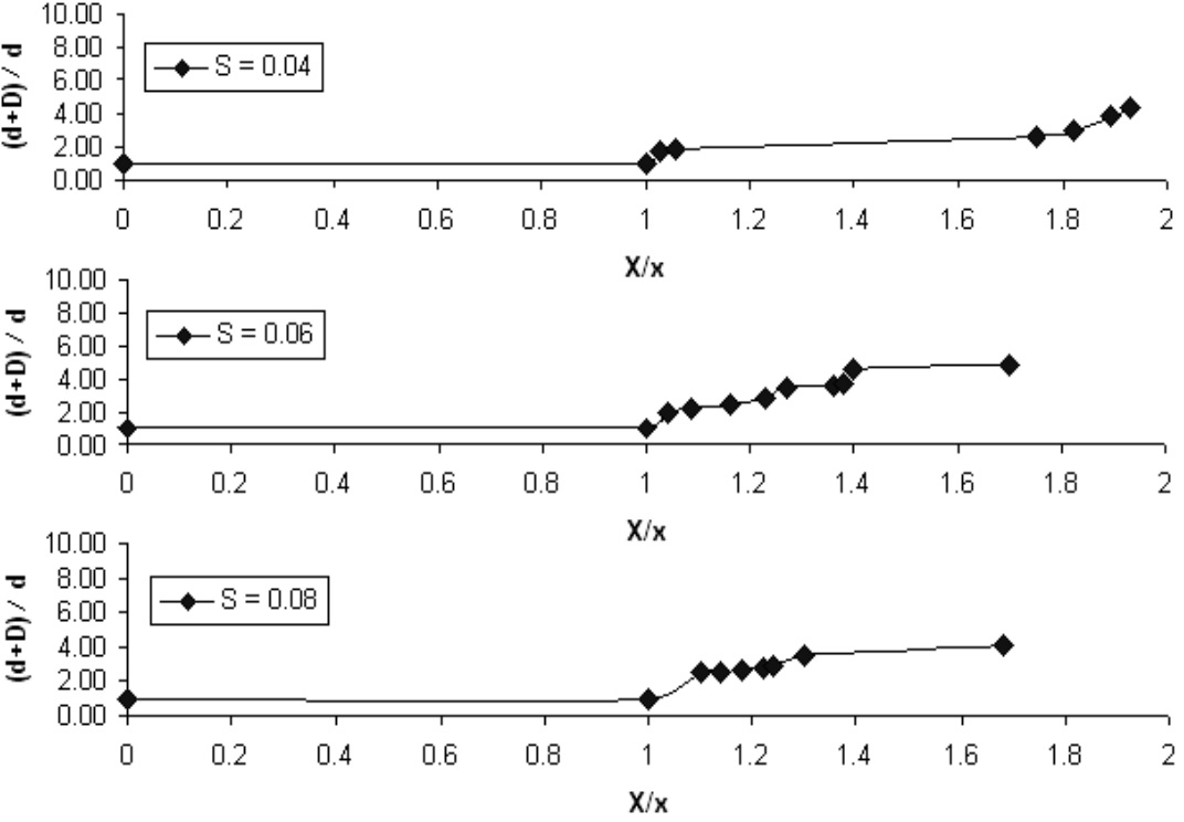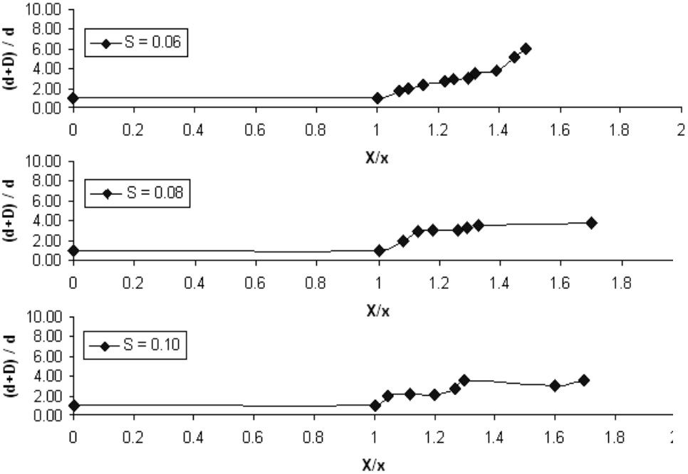 La matriz C1 presenta una elevación aproximada de 6 para S = 0.04 y alcanza una elevación (d + D)/d ≈ 9.0 con una distancia de recorrido de 1.9, para S = 0.06. Para las pendientes de 0.04 y 0.08 el comportamiento de las partículas de la matriz C1 es regular. Las partículas de la matriz C2 también tienen un comportamiento regular para las pendientes 0.04, 0.08 y 0.10. Para la pendiente S = 0.06 se produce un salto acelerado de la partícula a partir de X/x igual a 1.6.