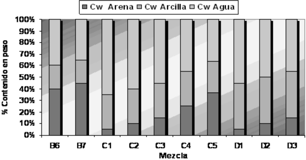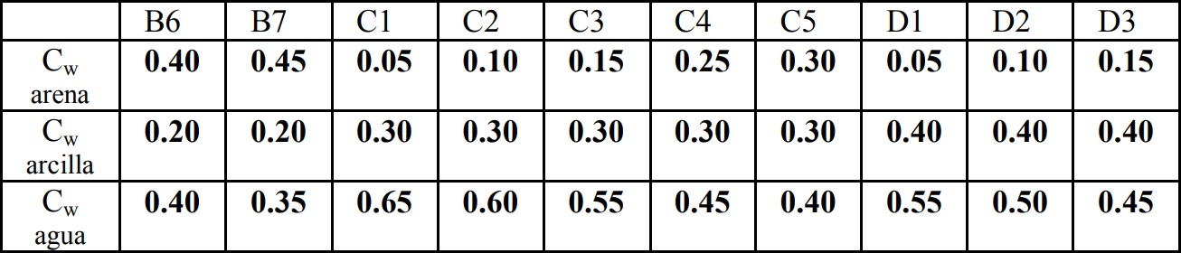 la arena, arcilla y agua para cada matriz se presentan en la Tabla 1.