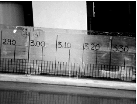 Uno de los costados del canal fue rayado con líneas oscuras paralelas y perpendiculares al lecho, formando cuadrículas de 1 cm2 presentado en la Fig. 5. Esto último, permitió mantener un registro continuo del frente de onda, así como localizar la traza superficial descrita. Al canal se le adaptó una compuerta plana de superficie lisa que retiene la matriz de barro aguas arriba. La compuerta se remueve verticalmente, liberando la mezcla almacenada de arena y arcilla saturada en agua.