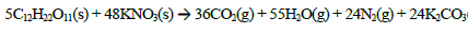 (2)Para hacer este cálculo, es necesario obtener el coeficiente de expansión térmica de la mezcla de gases (γ) y el peso molecular (M) y la constante universal de los gases ideales (R = 8,314 J/mol K). La temperatura correspondiente al instante en que se produce la Fmax en cada caso, se muestran en la tabla 2. Los términos γ y M los calculamos a partir de la ecuación balanceada de la reacción entre KNO3 y C12H22O11 presentada por Dineen (2009), mostrada a continuación: