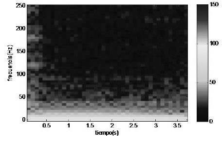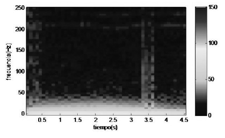 El espectrograma de la curva en la figura 14, el rango de tiempo donde se identifican los mayores valores de frecuencia es entre 0,75 y 1,85 s.