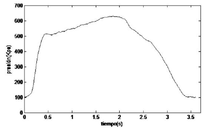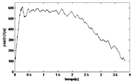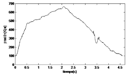 La curva P-t de la prueba 1 se presenta el la figura 5, el valor máximo de presión es de 666,58 kPa, el cual ocurre a los 2,08 s teniendo un tiempo total de lectura es de 4,59 s. El espectrograma de la curva P-t se presenta en la figura 6, aquí se observan dos rangos donde se presentan las frecuencias de mayor valor entre 0,8 y 1s, y entre 3,35 y 3,65 s.