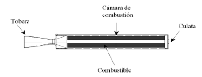 Para la realización del presente trabajo se utilizó una cámara de combustión con las mismas características del motor utilizado por el cohete sonda ULA 1A (Marcano y col., 2009), la cual se puede apreciar en la figura 1, fabricado a partir de un tubo mecánico sin costura de acero AISI 1020, adquirido en la empresa FERRUM ACEROS C.A., al cual se acopla mediante una rosca la tobera y la culata, fabricadas ambas en acero AISI 1045. En la figura 2 se muestra un diagrama general que ilustra la ubicación de estas piezas.