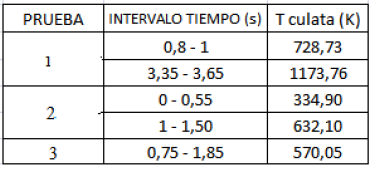 Se puede observar que en las tres pruebas las Fmax están muy por debajo de las Faxialres, por lo cual las oscilaciones de presión producidas en la cámara de combustión, se originan debido a variaciones instantáneas en la velocidad de combustión. Estas variaciones, son inducidas por la formación de vórtices en los cambios de sección entre la cámara de combustión y la tobera, influyendo considerablemente en la presión interna de la cámara, siendo este un ciclo que se retroalimenta hasta que se consume la totalidad del combustible (Prahalad y col., 2012). Las oscilaciones observadas en las tres pruebas son de baja amplitud y frecuencias (<50 Hz), clasificándose como oscilaciones de presión uniformes (Barrere 1992).
