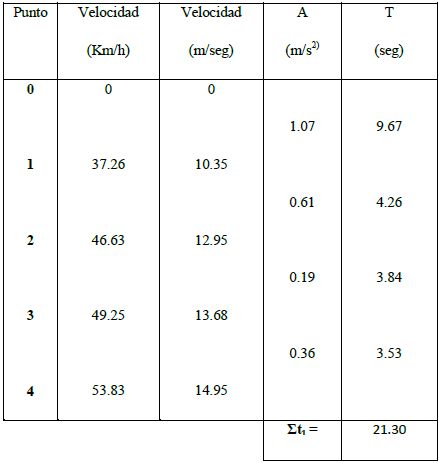 - Para el sentido Mérida- El Vigía se realizó el mismo procedimiento anteriormente descrito, con la diferencia que la persona que tenía que levantar la bandera se ubicaba en los puntos adicionales que se encontraban a 35m (Punto 1), a 85m (Punto 2), a 135m (Punto 3) y a 185m (Punto 4) del reductor en estudio; y la persona con el cronómetro se encontraba en los puntos adicionales situados a 65m (Punto 1), a 115m (Punto 2), a 165m (Punto 3) y a 215m (Punto 4) con respecto al eje de referencia ( Punto 0). (Ver Figura 1)