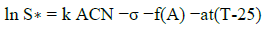 (5)se tiene que k = 0,1, σ = -3, at = -0,01 y f(A) se asume como una constante. De esta manera, la relación lineal entre la S* y el ACN de los alcanos lineales es la siguiente: