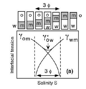 Se sabe desde hace mucho tiempo que las propiedades de los sistemas surfactante-aceite-agua (SOW) dependen de la naturaleza de los componentes así como de la temperatura, y poco a poco se ha tratado de cuantificar los efectos. Los sistemas surfactante-agua-aceite en el equilibrio han sido estudiados midiendo la evolución de la tensión interfacial cuando se cambia una variable de formulación, correspondiendo el mínimo de tensión interfacial a la llamada formulación óptima (Salager 1977, Salager y col., 1979, Bourrel y col., 1980, Salager y col., 2013A). Algunas correlaciones empíricas para la obtención de la formulación óptima para una tensión interfacial mínima o un comportamiento de tres fases han sido reportadas para varios tipos de surfactantes y mezclas (Salager y col., 1979, Bourrel y col., 1980B, Salager y col., 2000). La determinación de la formulación óptima se realiza a través de barridos de formulación, cambiando una variable a la vez, por ejemplo, la salinidad del sistema y obteniendo el valor de esta variable donde se posee mínima estabilidad o un mínimo de la tensión interfacial como se presenta en la figura 1 (Salager y col., 2001).