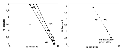 En la Figura 2 se estudia la influencia de la concentración del alcohol y una variable de formulación, en este caso la salinidad, sobre el comportamiento de fase para sistemas con fases oleosas compuestas por un aceite apolar como el queroseno (Izq.) y una polar aceite de soya (Der.). La formulación óptima se determinó en el caso del queroseno visualmente a través de la microemulsión bicontinua WIII presente, mientras que en el sistema con aceite de soya, al no presentarse microemulsión bicontinua, la salinidad a la formulación óptima se obtuvo a través de la medición de la tensión interfacial. Se observa que existe una relación lineal entre el % de Pentanol y el % de salinidad en ambos casos, lo cual puede presentarse debido a que la contribución f(A) del alcohol se comporta de forma proporcional con la concentración del alcohol f(A) = mA, donde A es la concentración del alcohol y m una constante. Zhou y col., 2001 y Zhang y col., 2002 muestran que para una relación molar de dodecil sulfato de sodio a pentanol mayor a 1: 3 (la cual correspondería a 0,67% de pentanol para un 0,57% de DSS presente en el sistema) la interfase se satura de pentanol y por lo tanto a concentraciones mayores (en este trabajo de 5% de pentanol) se segrega de manera importante a la fase aceite. El mismo fenómeno ocurre tanto para el queroseno como para un aceite polar como el aceite de soya. El EACN obtenido utilizando la ecuación HLD=0 para este sistema resultó para el queroseno de 8,6 y para el aceite de soya de 8,1.
