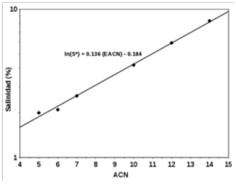 (2)El concepto de formulación óptima generalizada ex-presado por la ecuación anterior en base a un barrido de salinidad, hace uso del llamado Número de Carbonos del Al-cano Equivalente (EACN por sus siglas en inglés) el cual es el número de carbonos de un alcano lineal que posee un comportamiento equivalente en la formulación óptima al del aceite estudiado (generalmente polar) y se utiliza para cuantificar la contribución de una fase oleosa que no es un n-alcano. Este concepto fue introducido por Cash y col. en 1977, y presentado por Graciaa y col. en 1993. Se ha mostrado que cuando la polaridad del aceite aumenta, su valor de EACN disminuye (Miñana y col., 1995).