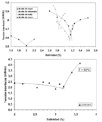 En las Figura 4 se presentan las medidas de tensión interfacial en función de la salinidad en los sistemas aceite triglicérido-DSS-pentanol-fase acuosa y dodecanol-DSS- pentanol-fase acuosa. Se observa que la salinidad óptima para el aceite de coco fue la más baja, seguida por los aceites de maíz, almendra y soya, esto se debe a que un aumento del EACN del aceite es balanceado por un incremento de la salinidad en la ecuación de HLD, por lo tanto, el predominio de ácidos grasos de 12 carbonos en los triglicéridos del aceite de coco hace que su EACN sea menor con respecto a los aceites de maíz, almendra y soya, donde predominan los ácidos grasos oléico y linoléico de 18 carbonos. La salinidad óptima del dodecanol como aceite se obtuvo para observar el efecto del grupo OH sobre el EACN de aceites polares, particularmente el efecto del OH en la disminución del EACN del pentanol, el cual se comporta en este caso como un aceite polar que disminuye el EACN de la mezcla de aceites presentes en el sistema.