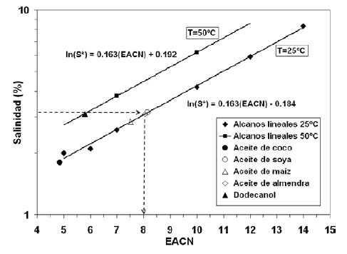 En la Fig. 5 se presenta la relación de la salinidad en la formulación óptima (S*) en función del ACN del sistema alcano lineal/DSS/pentanol/fase acuosa a 25 y 50 ºC y los EACN de los aceites triglicéridos de coco, maíz, soya, almendra y el dodecanol, los cuales fueron calculados a partir de la correlación entre ln(S*) y el EACN, los valores obtenidos se muestran en la tabla 3.