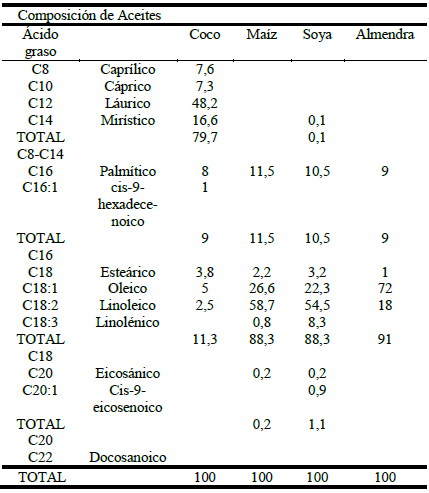 La formación de una fase de microemulsión bicontinua en la formulación óptima en sistemas alcano lineal/DSS/pentanol/fase acuosa ha sido estudiada para obtener modelos que permitan relacionar los parámetros de formulación con el comportamiento de fase de los sistemas SOW (Salager y col., 2001). En la Tabla 1 se muestra la composición de los aceites triglicéridos utilizados en el presente estudio: coco, maíz, soya y almendra con respecto a la longitud de la cadena hidrocarbonada y grado de saturación de los ácidos grasos que los conforman (Flick 1998).