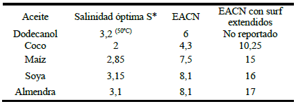 Hace unos 20 años (Miñana y col., 1995) y en estudios más recientes (Witthayapanyanon y col., 2006, Phan y col., 2010, Forgiarini y col., 2010) usando surfactantes extendidos, se ha determinado que la estructura y grado de saturación de las moléculas que conforman los aceites triglicéridos modifican su EACN medido al comparar estos resultados con aquellos obtenidos con n-alcanos en ausencia de alcohol como se indica en la Tabla 2.