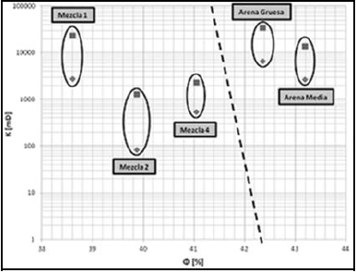 En la Fig. 3 se observa que los sand packs construidos a partir de una sola granulometría tienen valores de porosidad y permeabilidad mayores a los sand packs construídos con dos o tres granulometrías distintas, excepto en el caso de la Mezcla 1 (50% Arena Gruesa- 50% Arena Media) cuyos valores de permeabilidad son semejantes a los sand pack de granulometrías homogéneas. Existe también un aumento de la porosidad al disminuir el tamaño de grano en los sand pack homogéneos debido a que para un volumen fijo de un determinado grano, su equivalente volumétrico en granos de menor tamaño contendrá más espacios vacíos, aumentando de esta forma la porosidad en todo el medio. Los valores obtenidos para las Mezclas 2 y 4 muestran que la permeabilidad (tanto al gas como al agua) es también función de la uniformidad granular y del tamaño de grano.