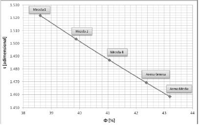 La Fig. 5 muestra cómo se relacionan la tortuosidad y la porosidad para los distintos sand pack. Se puede observar que existe una correspondencia negativa entre las dos variables en juego. La tortuosidad se hace cada vez más grande a medida que la porosidad disminuye. Cuanto menor es la porosidad, más larga es la longitud de la trayectoria del flujo. A medida que los sand pack se tornan más heterogéneos en relación a su granulometría, la tortuosidad crece, debido a que el flujo es obstaculizado por los granos de menor tamaño.