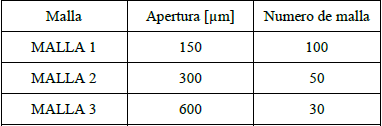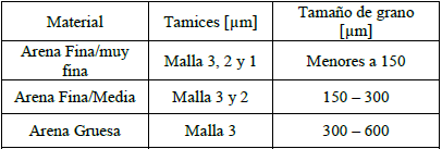 Para estudiar las propiedades petrofisicas de los sand pack y poder caracterizarlos, se procedió a preparar en nuestro laboratorio tres tipos de material de diferente granulometría: material fino (menor a 150 μm, arena fina a muy fina), medio (150 a 300 μm, arena fina a media) y grueso (300 a 600 μm, arena mediana), Tablas 1 y 2.