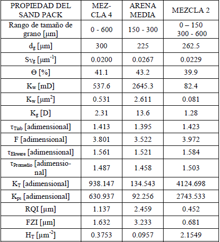 Considerando que el sand pack puede asimilarse al caso de un medio compuesto por arena no consolidada, los factores de geometría interna y de cementación toman los valores de 1.49 y 1.09 respectivamente, por lo que la ecuación utilizada fue