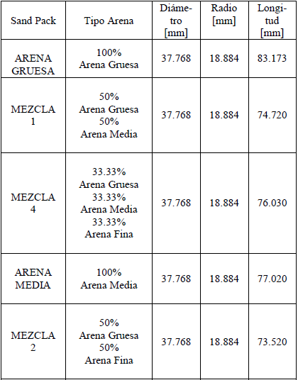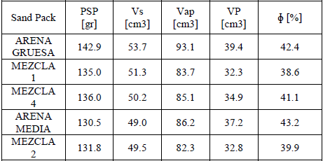 En la Tabla 5 se presentan la porosidad obtenida y la densidad de la arena utilizada
