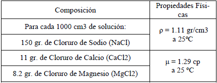 Para saturar los sand pack y luego medir la permeabilidad al líquido, se utilizó Agua sintética denominada 2 API como sustituto del agua de formación, filtrada a 0.2 μm, su composición y propiedades físicas se muestran en la siguiente tabla: