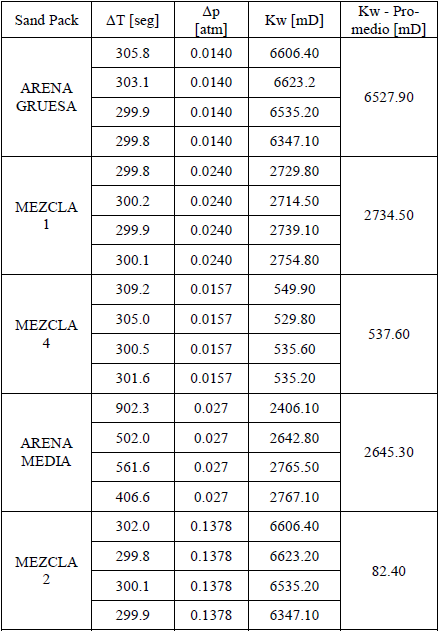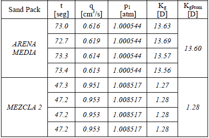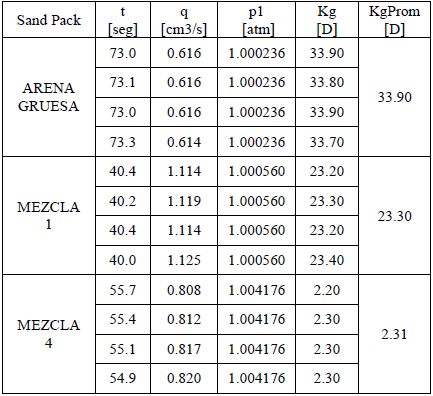 Se realizaron 4 mediciones de la Permeabilidad al gas en cada sand pack, y se tomó el valor promedio para obtener un valor consistente. Se midió haciendo pasar un volumen de 45 cm3 de gas nitrógeno en cada medición, de viscosidad de 0.018 cp, en celda de empaquetamiento tipo Fancher con 200 psi de presión de confinamiento, 1 Atm de presión en cara de salida, y un área de 11,197 cm2. Se calculó la Kg para cada ensayo y finalmente, se tomó un valor de Kg promedio para cada sand pack.