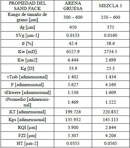 Se midieron las propiedades de cada sand pack a condiciones standard (STD), la densidad de grano y su permeabilidad al líquido.