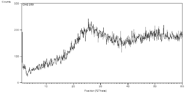 En la figura 1, se muestra el patrón de DRX correspondiente al catalizador MoS2soportado.Se observa una señal ancha de baja intensidad entre valores de 2Ɵ de20 y 30º, correspondiente a la fase amorfa atribuida al soporte; además, demuestra la ausencia de la fase cristalina del sulfuro de molibdeno, que puede encontrarse muy bien distribuida sobre los canales del soporte me soporoso con un tamaño nanométrico, el cual es difícil de detectar por el método de DRX (Hussain y col., 2006).