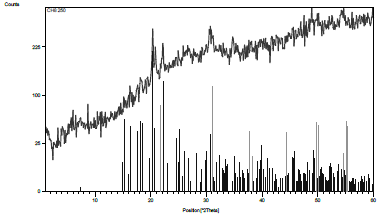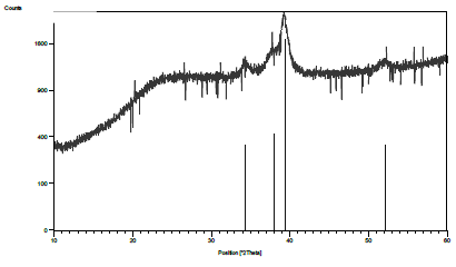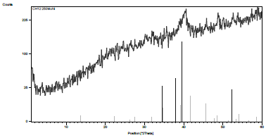 En la figura 3 se muestra el difractograma del catalizador, MoCS-250. La fase presente (Mo2C) se identificó de nuevo por comparación con la base de datos lo que indica que el catalizador se sulfuró parcialmente por la presencia de Mo2C aún después de sulfurar.