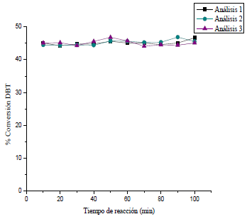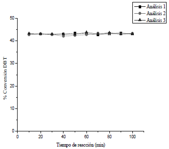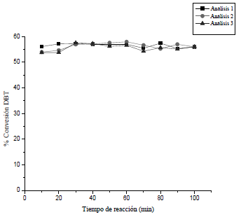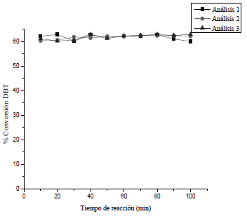 En la figura 5, se presentan los resultados de conversión para el catalizador de Mo sulfurado directamente. Estos análisis fueron realizados por triplicado con el fin de estudiar la reproducibilidad de los datos. Se observa que dicho catalizador presenta una gran estabilidad durante los 100min de reacción. La conversión obtenida es del 58%.