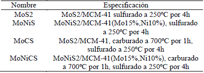 La Tabla 1 muestra las especificaciones de los catalizadores desarrollados.