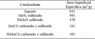 Los valores de área superficial para los catalizadores obtenidos mediante carburación son inferiores a los sintetizados mediante sulfuración directa. Esta disminución del área superficial se puede atribuir a dos factores, a la presencia de las fases Mo2C y Ni2Mo4C que pueden encontrarse entre los poros del mesoporoso y por tanto pueda disminuir el área porosa por unidad de masa a las condiciones de preparación de los sólidos para su carburación, que pueden favorecer un colapso de la estructura mesoporosa, que aporta la mayoría del área superficial al catalizador final (Van Veen y col., 1987).