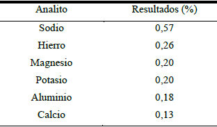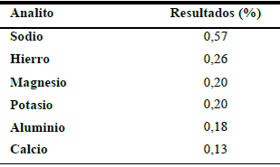 En la Tabla 3 se muestra el porcentaje de los elementos más comunes presentes en las cenizas de cascarilla de arroz. Todos los elementos se encuentran en porcentajes menores al 1,00 %, siendo el de mayor porcentaje el sodio con 0,57 % y el de menor valor el calcio con 0,13 %. Sus porcentajes pueden variar debido a factores geográficos, año de la cosecha, preparación de la muestra y métodos de análisis (Della y col., 2005).