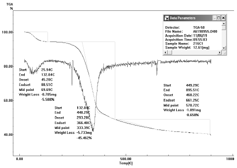 El primer pico que corresponde a los 132 oC, tiene que ver con la pérdida de la humedad de la cascarilla. El segundo y principal pico ocurre a los 448 oC aproximadamente. Este pico corresponde a las reacciones que se dan en la parte orgánica de la cascarilla de arroz y a la pérdida del material volátil. El último pico ocurre a los 570 oC aproximadamente, cuando el peso de la muestra permanece prácticamente constante y empieza la formación del SiO2 que se obtiene al finalizar el proceso de tratamiento térmico. De igual manera, en la curva de pérdida de peso, se observa que el peso empieza a mantenerse constante a los 570 oC, y que la mayor pérdida de peso se da entre los 135 y 450 oC aproximadamente.