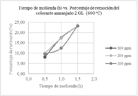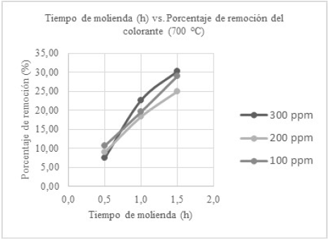 La Fig. 3 corresponde a la SiO2 obtenida mediante un proceso de tratamiento térmico a 700 oC. En esta figura se puede observar que se obtuvo un porcentaje máximo de remoción del colorante de 30,00 % a la concentración de 300 ppm y para un tiempo de molienda de 1,5 h. El porcentaje de remoción menor es de 8,00 % y corresponde a la concentración de 300 ppm y a un tiempo de molienda de 0,5 h.