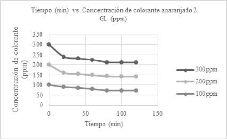 Por otra parte, en la Fig.5, se detalla la cinética de adsorción del colorante anaranjado 2 GL a tres concentraciones diferentes, en SiO2 activa obtenida a 800 oC y 1,5 h de molienda. Como se puede observar, el proceso de adsorción dura 120 min, y la concentración del colorante empieza a mantenerse constante a partir de los 80 min del proceso. Este tiempo sirvió para la construcción de las isotermas de adsorción de Freundlich.