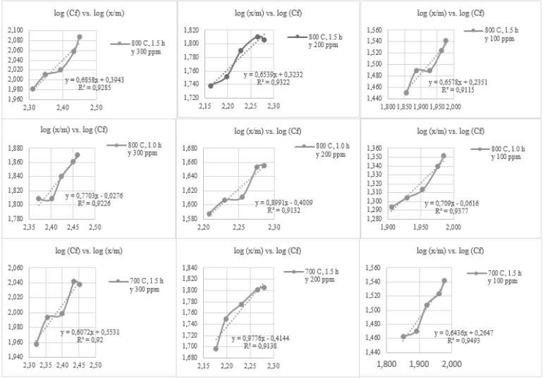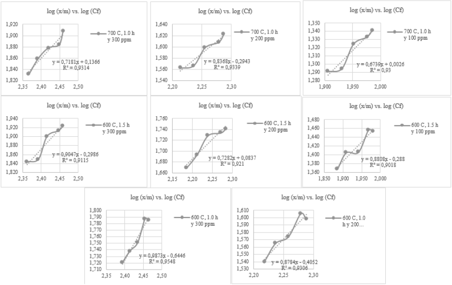 Las muestras correspondientes a 800 oC, 0,5 h; 100; 200 y 300 ppm; 700 oC; 0,5 h; 100; 200 y 300 ppm; 600 oC; 1,0 h y 100 ppm; y 600 oC; 0,5 h; 100; 200; y 300 ppm no se tomaron en cuenta debido a que no se pudieron construir las isotermas de adsorción de Freundlich por la dispersión de sus datos, por lo que los valores de R2 de las regresiones lineales fueron muy lejanos a 1. Este fenómeno es debido al tiempo de molienda de 0,5 h que no logró activar la SiO2 para realizar la adsorción, en el caso de las temperaturas de 700 y 800 oC. Y en el caso de la temperatura de 600 oC se dio debido a la diferencia de concentración de SiO2 que es de casi el 6 % y también debido al tiempo de molienda de 0,5 h.