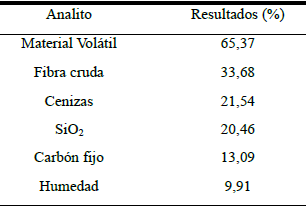 Se caracterizó la cascarilla de arroz obteniendo un porcentaje de material volátil del 65,37 %, fibra cruda 33,68 %, cenizas 21,54 %, SiO2 20,46 % carbón fijo 13,09 % y humedad de 9,91 %.