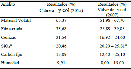 Como se detalla en la Tabla 2, todos los parámetros que se analizaron para caracterizar la cascarilla de arroz, se encuentran dentro de rangos que se han obtenido en estudios previos. Estos estudios fueron realizados por Valverde y col. 2007, Genieva y col., 2012, Soltani y col., 2015.
