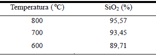 Se determinó la pureza de la SiO2 obtenida a las temperaturas de 600, 700 y 800 oC, mediante un análisis de fluorescencia de rayos X. Los resultados se detallan en la Tabla 4.