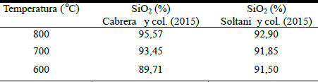 En la Tabla 5 se compara el porcentaje de SiO2 obtenido por Soltani y col., 2015 con el de este estudio. Como se puede observar, existe una diferencia insignificante en los resultados de los dos estudios. La mayor diferencia se da entre los porcentajes obtenidos a 800 oC y es de 2,67 %. Esta pequeña diferencia pudo haberse suscitado debido a la normativa del análisis o a los equipos utilizados para el tratamiento térmico.