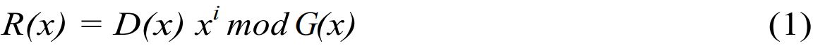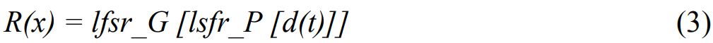 De esta manera se ha identificado que el procesamiento de los datos d(x), al aplicar una función LFSR para generar las secuencias del multiplicador GF y del codificador RS, por lo que se puede expresar, en función de los correspondientes polinomios generadores de la secuencia del LFSR, siendo G(x), el polinomio generador de código, característico del LFSR externo y P(x), el polinomio característico del campo GF, asociado al LFSR interno, obteniendo la ecuación 3.