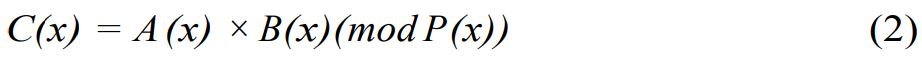 Si P(x) es el polinomio irreducible, entonces la multiplicación de dos elementos del campo, representados como los polinomios A(x) y B(x), es el producto algebraico de los dos polinomios, y la reducción modular con P(x), como se presenta en la ecuación 2.