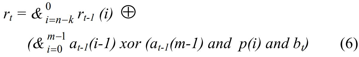 De la generalización del método para el cálculo de los coeficientes at,i, se obtuvo la ecuación, para generar cada elemento, correspondiente a aplicar el circuito LFSR sobre un polinomio A(x) xi, estos dependen del instante de tiempo y la posición del elemento en el polinomio, el coeficiente pi está dado por la posición del coeficiente en el polinomio generador del campo P(x), el cual será fijo en el tiempo.