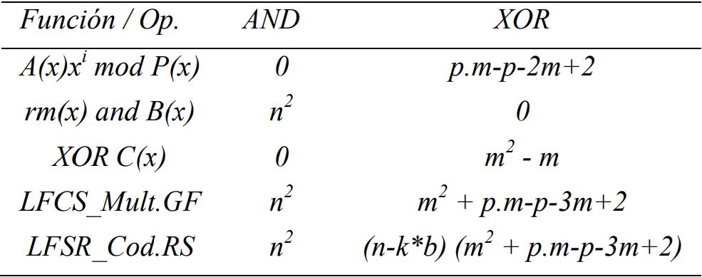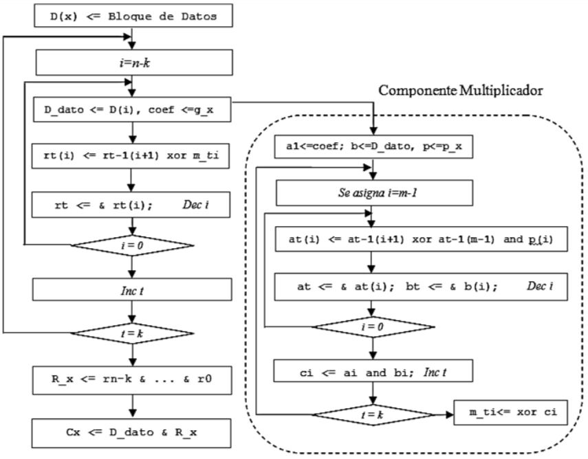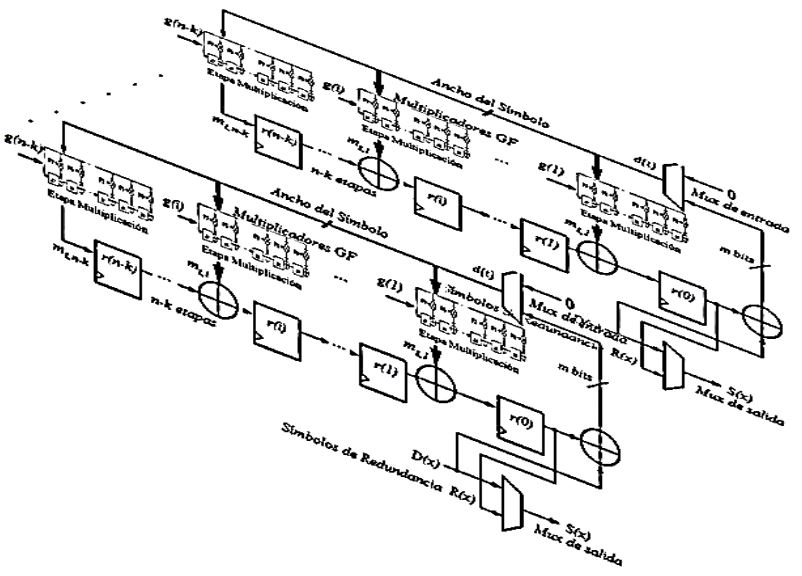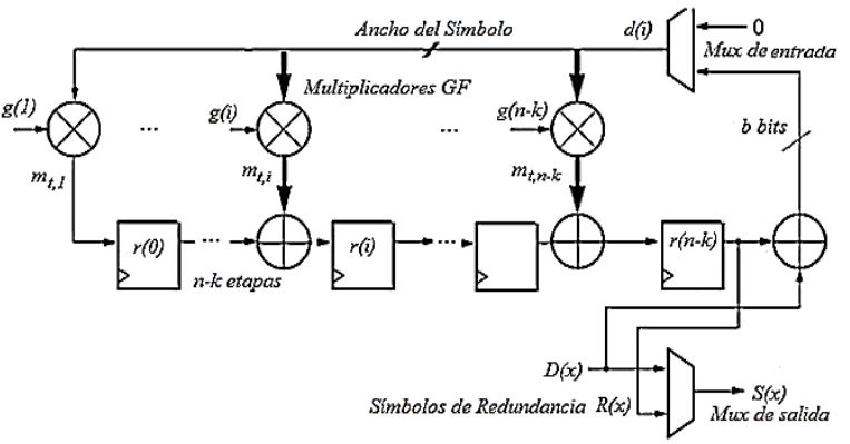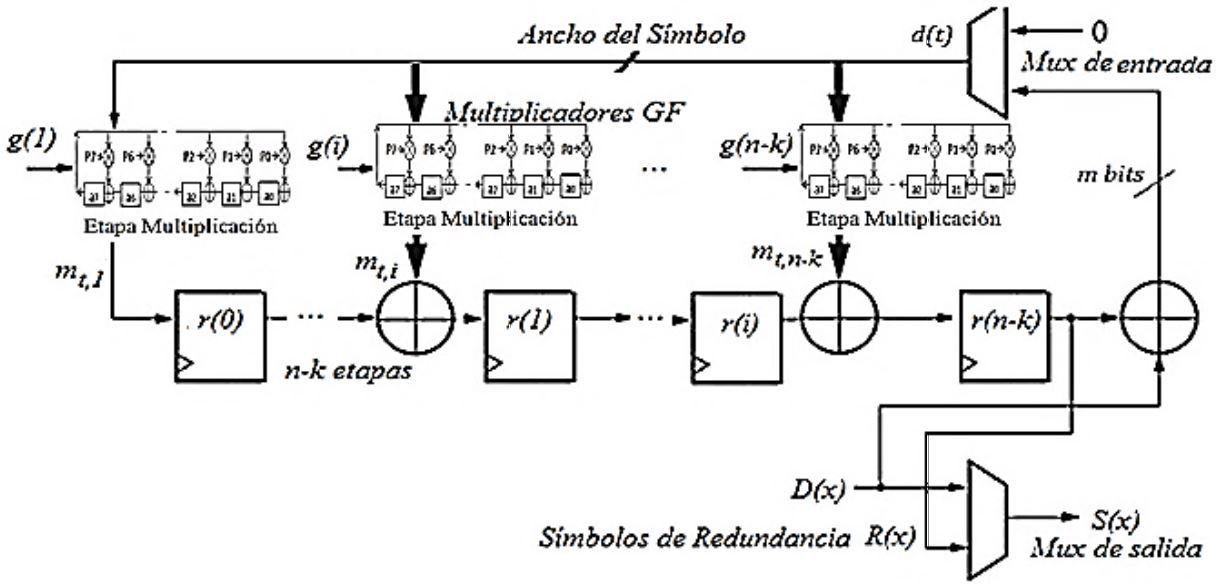 Esto se lleva a cabo, a través de componentes multiplicadores en campos finitos de Galois GF(2m), los cuales son los responsables de obtener los elementos a operarse en las compuertas XOR y almacenarse en los elementos de memoria, como se muestra en la figura 1.