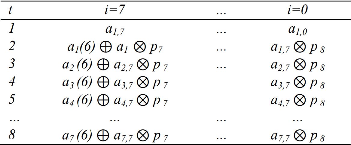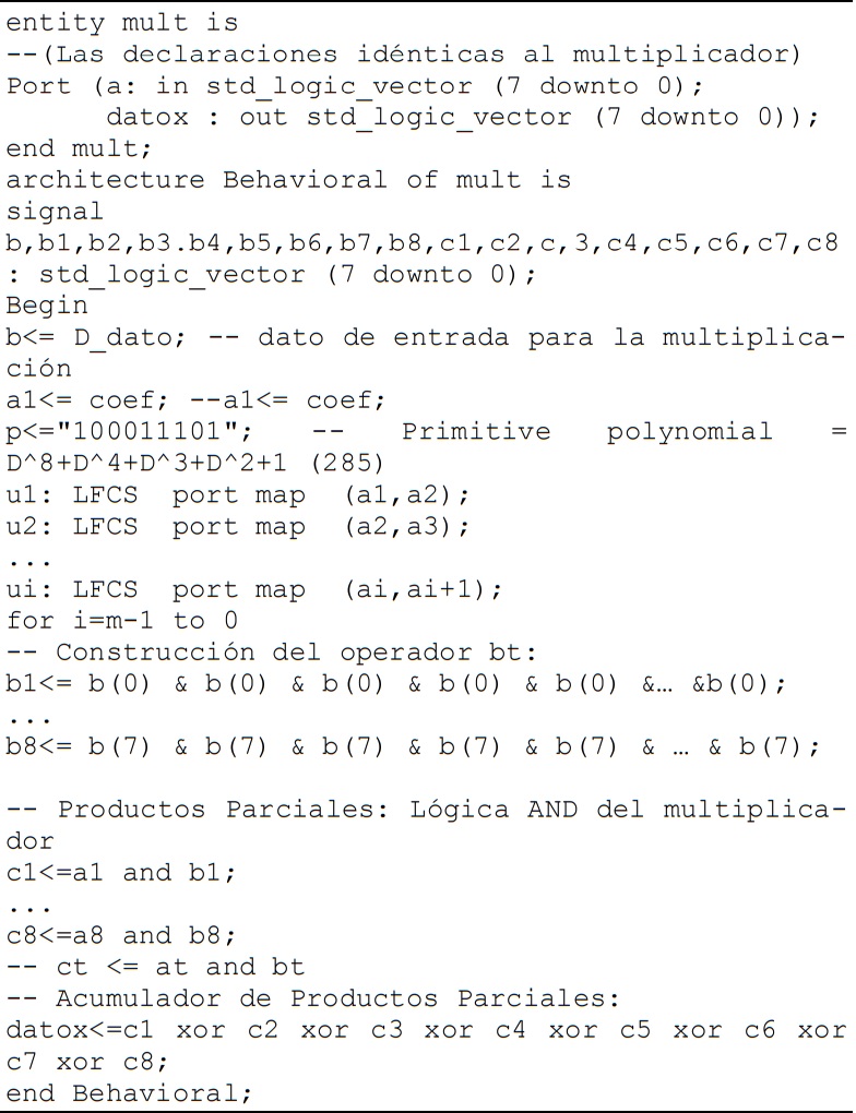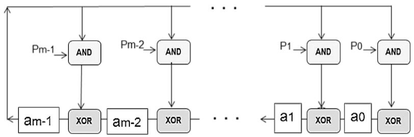 Este elemento at, operando A reducido al campo F, se opera and con bt, correspondiente al bit t del operando B, siendo t el parámetro para identificar cada uno de los bits del símbolo y p(i), el coeficiente i del polinomio P(x). Es de hacer notar la naturaleza recursiva de la implementación, ya que para el cálculo de uno de los elementos correspondientes a la salida de la rama en la posición i, estará dada por el resultado del término correspondiente i-1. Esta característica permite definir los elementos circuitales necesarios para su generación concurrente, a partir de un arreglo combinacional.