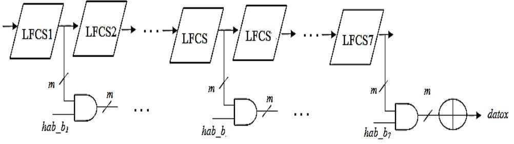 De forma alternativa, la descripción del multiplicador, se puede particionar la implementación en componentes LFCS (LFSR concurrentes), logrando una representación RTL multinivel por elementos circuitales, para describir sub-funciones reutilizables. Este concepto de lógica multinivel (Imaña y col., 2002), permite definir componentes circuitales interconectados, a través de capas, para generar las salidas.