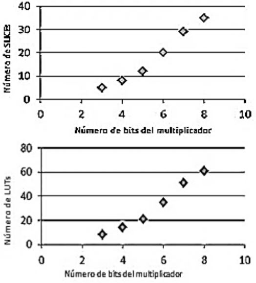 Del mismo modo para este modelo se obtuvo el consumo de recursos del FPGA, a través de la herramienta de desarrollo ISE 11, obteniendo el consumo de Slice y LUTs Tables en función del número de bits del multiplicador (ver figura 6).