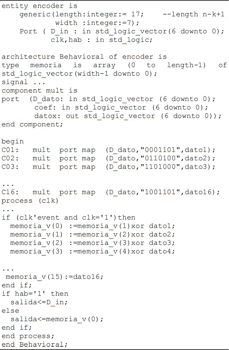 De la descripción en VHDL se puede observar que se ha definido el codificador, basado en componentes: (1) el componente multiplicador (mult), que presenta el circuito de multiplicación en campos finitos, al cual se le ingresan los operandos por los puertos correspondientes a D_dato, dato a operar y el coeficiente de G(X), para cada rama, (2) los registros definidos como memoria y sus operaciones xor, donde se realiza el corrimiento de los datos resultantes, funcionando como un registro desplazamiento, con la realimentación respectiva. A partir de la descripción VHDL, se puede definir el diagrama para la generación del código (ver figura 4).